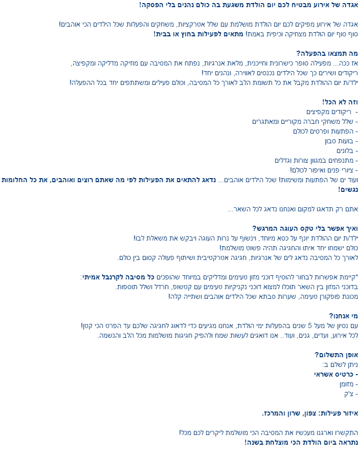 חבילות ימי הולדת מקסימות במחירים אטרקטיביים ביותר! השכרת ציוד ופעילויות מגוונות!
