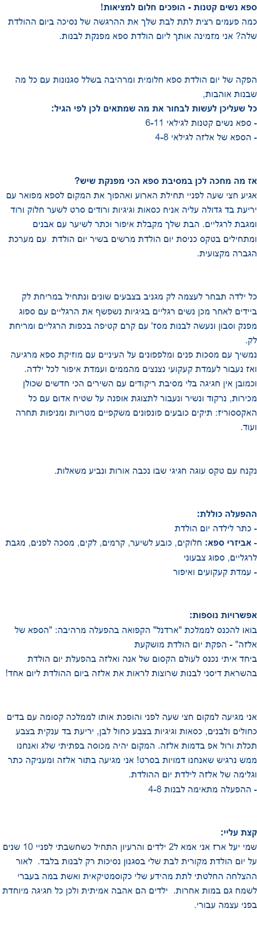 יעל המקסימה תודה על יום הולדת מושקעת וסוחפת הבנות ממש נהנו היו בעננים והכי חשוב שאמה נהנתה מאוד