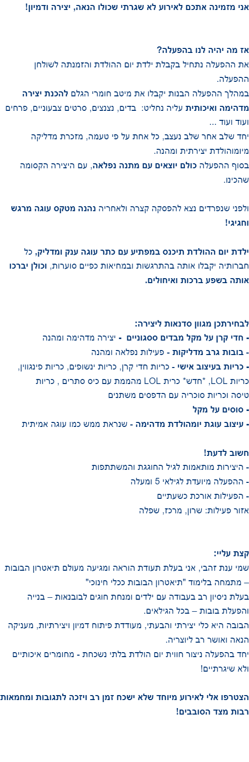 ענת תודה רבה על הפעלת היום הולדת ליהלי היתה יומולדת מקסימה ואיכותית??